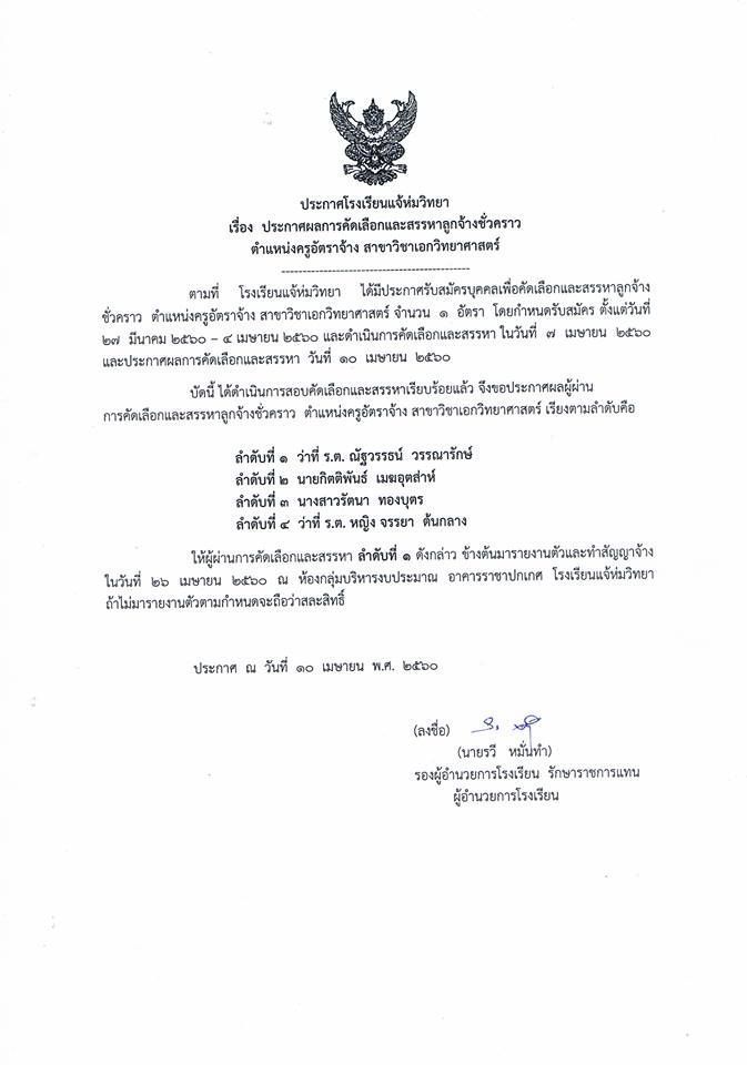 ประกาศผลการสอบคัดเลือกครูอัตราจ้าง สาขาวิชาวิทยาศาสตร์