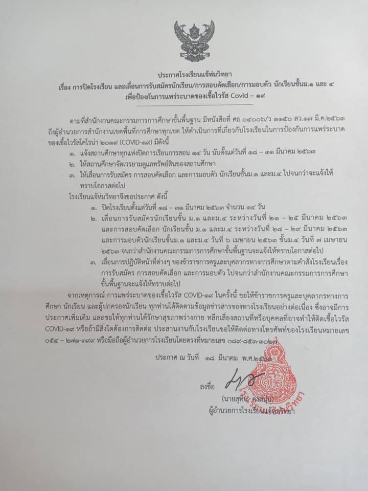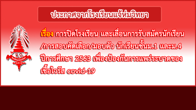เรื่อง การปิดโรงเรียน และเลื่อนการรับสมัครนักเรียน/การสอบคัดเลือก/มอบตัว นักเรียนชั้นม.1 และม.4 ปีการศึกษา 2563 เพื่องป้องกันการแพร่ระบาดของเชื้อไวรัส covid-19